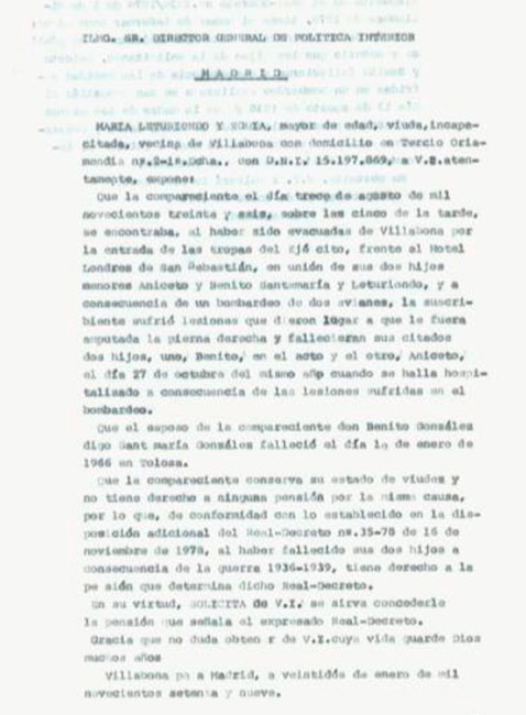 Maria Leturiondo berak ondo azaltzen du zer gertatu zitzaien bere semeei. Anicetoren heriotz agiriak gaixotasuna adierazten badu ere berak argi adierazten du: se halla hospitalizado a consecuencia de las lesiones sufridas por el bombardeo.